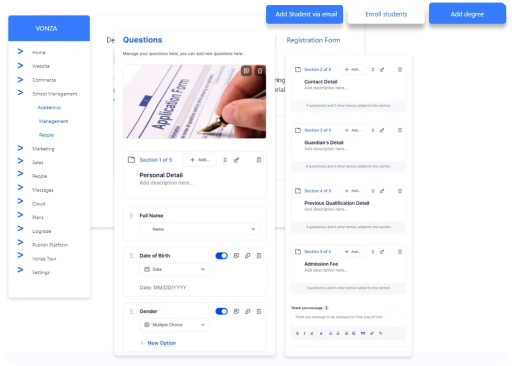 Vonza School ERP software is a complete education management software solution for schools, universities, training institutions and colleges to streamline and automate their operations. Easily do admissions, host your degrees, courses, run live sessions and collect fees